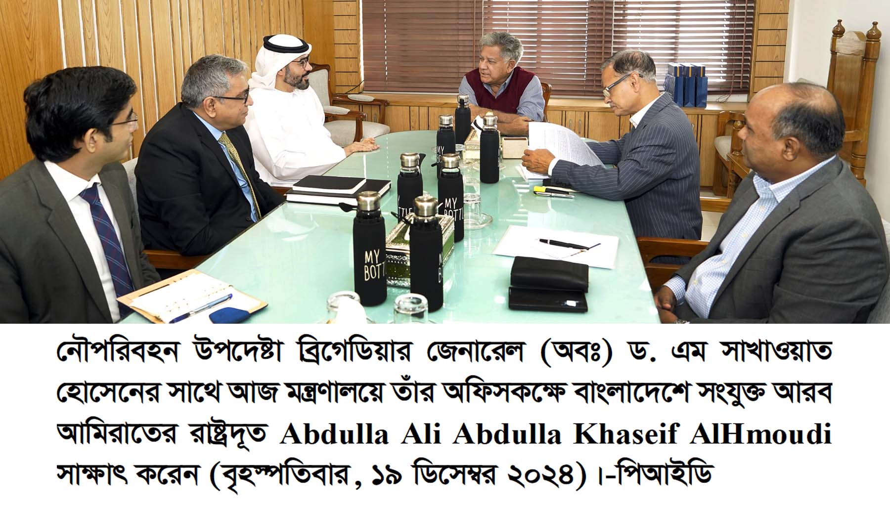 সীন্দবাদ ডেস্ক:: নৌপরিবহন এবং শ্রম ও কর্মসংস্থান উপদেষ্টা ব্রিগেডিয়ার জেনারেল (অব:) ড. এম সাখাওয়াত হোসেন এর সাথে সাক্ষাৎ করেছেন বাংলাদেশে নিযুক্ত সংযুক্ত আরব আমিরাতের (ইউএই) রাষ্ট্রদূত আব্দুল্লাহ আলী আব্দুল্লাহ খাসিফ আল হামুদি। বৃহস্পতিবার (১৯ ডিসেম্বর) সকালে নৌপরিবহন মন্ত্রণালয়ে নৌপরিবহন উপদেষ্টার সঙ্গে সাক্ষাৎ করেন তিনি।