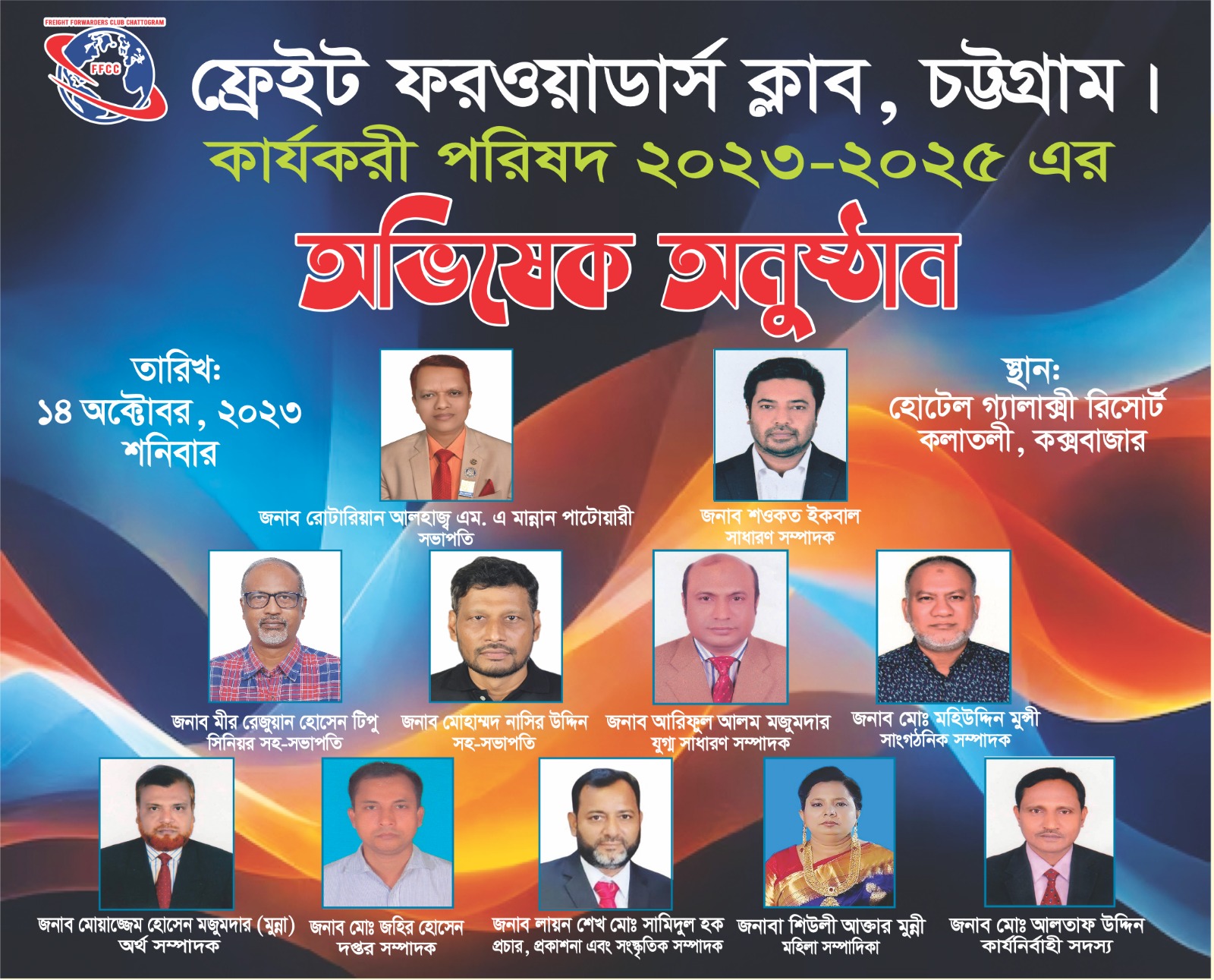 শিপিং জগতে ফরওয়ার্ডিং মালিকদের সমন্বয়ে গঠিত ফ্রেইট ফরওয়াডার্স ক্লাব, চট্টগ্রাম (২০২৩-২০২৫) এর নবগঠিত কার্যকরী পরিষদের অভিষেক ও শপথ গ্রহণ অনুষ্ঠান শনিবার (১৪ অক্টোবর) কক্সবাজারের হোটেল গ্যালাক্সি রিসোর্টে জমকালো আয়োজনের মধ্যে দিয়ে সম্পন্ন হয়েছে।